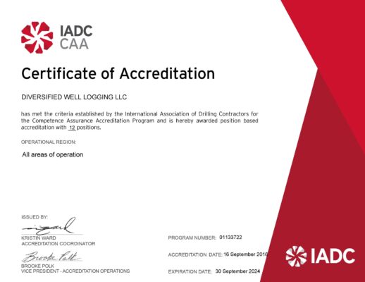 Diversified Well Logging wishes to thank everyone involved in helping the company gain IADC accreditation for its Competence Management Program for yet another year. Congratulations go to the QHSE management for the program's maintenance as our service options and necessary competencies grow, and of course to our field personnel for their diligence and hard work in delivering services that help Diversified stand out amongst its peers.