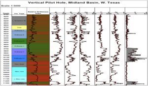XRF analysis was carried out on the samples, providing important insights into the nature of the elemental and mineralogical composition of the rock (and the cost-effective utility of the RoboLogger™️). Several observations can be drawn from the data. The Redox element vanadium, commonly a proxy for TOC (Total Organic Carbon), can be seen at its highest levels in the Woodford, Wolfcamp D and Wolfcamp D1. The most ductile rock can be seen from the green shading on the relative brittleness index in Wolfcamp C & D. Silica and Calcium trend in opposite directions as sequences change from predominantly siliciclastic to carbonates. See figure 1.