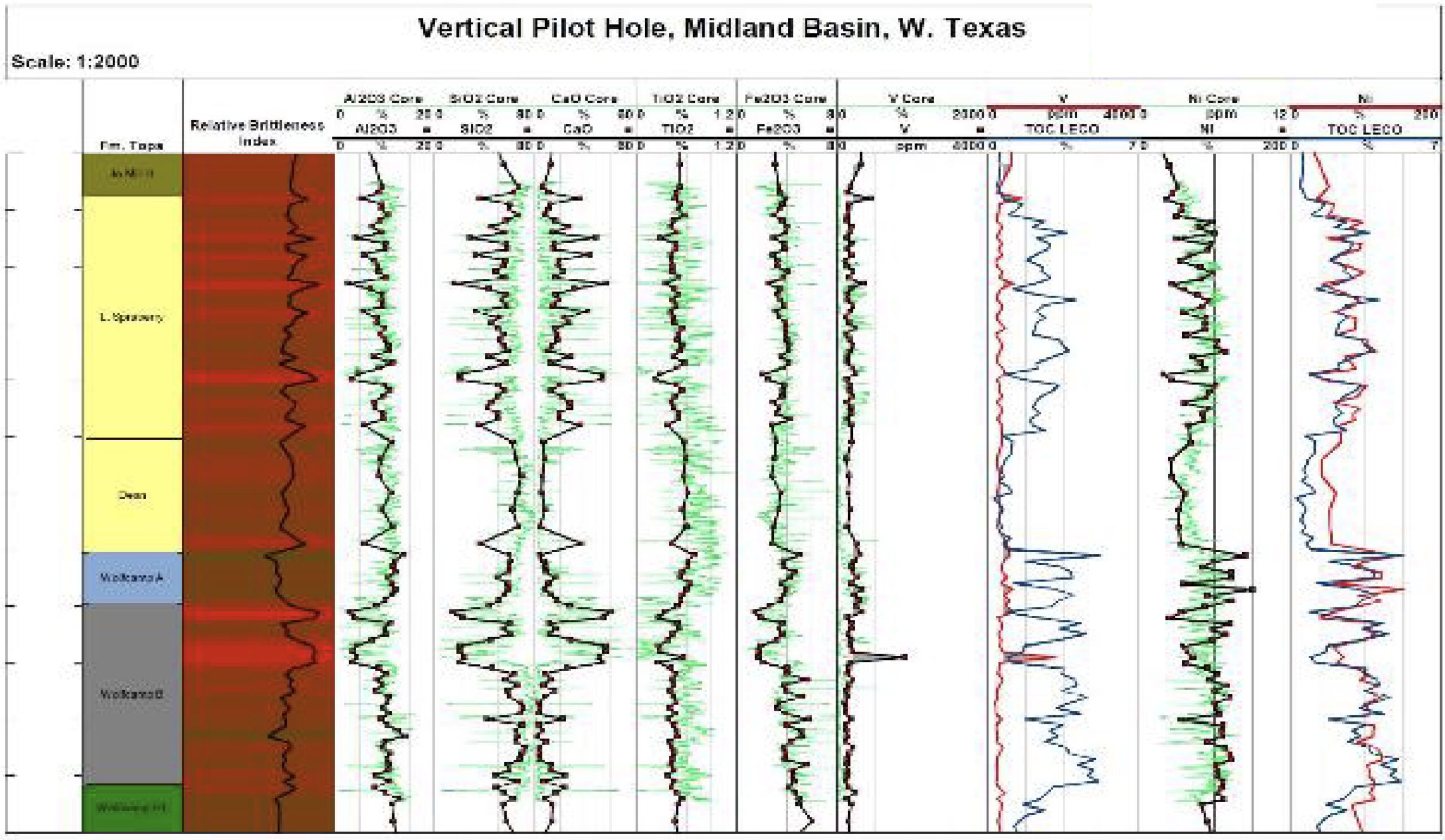 XRF analysis was carried out on the samples, providing important insights into the nature of the elemental and mineralogical composition of the rock (and the cost-effective utility of the RoboLogger™️). Several observations can be drawn from the data. The Redox element vanadium, commonly a proxy for TOC (Total Organic Carbon), can be seen at its highest levels in the Woodford, Wolfcamp D and Wolfcamp D1. The most ductile rock can be seen from the green shading on the relative brittleness index in Wolfcamp C & D. Silica and Calcium trend in opposite directions as sequences change from predominantly siliciclastic to carbonates. See figure 1.